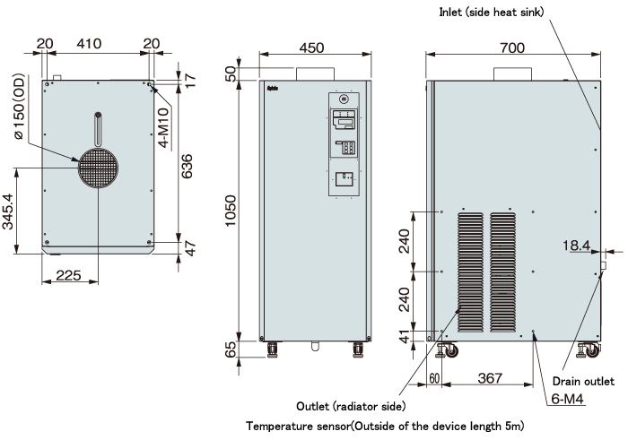 | *Cooling and heating capacity is the value in the body of the balloon when RH 25°C / 40% ambient temperature. *The temperature control precision constant temperature and humidity chamber JTMK01 - are based on the method set forth in Section 2 (Japan Testing Machinery Association) how to display performance test methods and performance. *Guarantee the accuracy of the point and one outlet in reading body temperature controller equipped with air conditioners, duct thermal interference due accuracy is not covered under warranty. *In addition, this product is intended to suppress the fluctuation of air temperature, but do not guarantee the absolute value of the temperature. (For bias correction function is equipped.) *Ambient temperature and humidity. Some may not be able to also control the temperature within the range set. *Is the value of the processing air volume in the outlet body. *Dimensions above are body dimensions. Mounting flange, protrusions are not included. *Current consumption, power consumption may vary depending on surrounding environment temperature and humidity and conditions of use. *For air-cooled type, there is waste heat from the equipment. (With exhaust chamber as an option) *Ambient environment at low temperatures below ambient temperature of the protective device is used to work, we will automatically shut down the compressor only. *In that case, we can not guarantee the accuracy of the above, please use the ambient temperature in the range of use. *The actual mounting on the check, I hope specification contained in the instruction manual, the precautions. *If you need instruction manual in advance on the design, please contact your nearest sales office. |